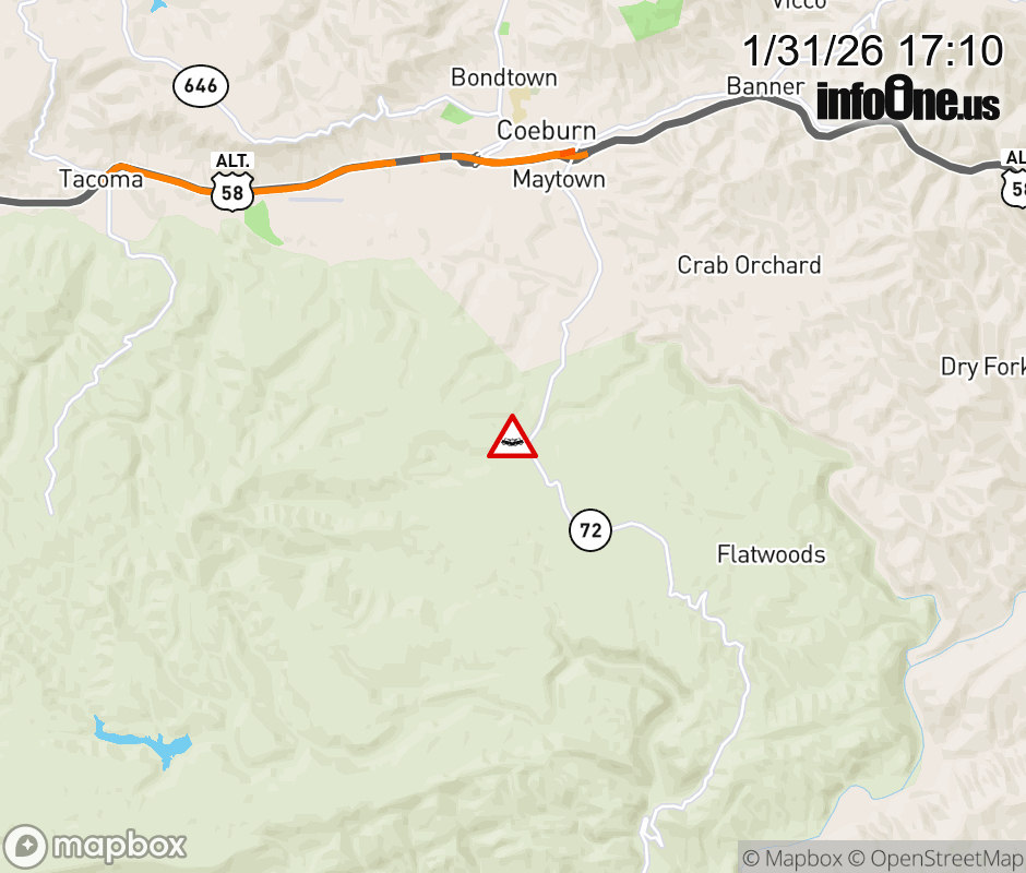 On Rt. 663 East in the County of Wise, in the vicinity of Dungannon Rd; VA-72N/S, motorists can expect delays due to a vehicle crash. Updated: Sat 1/31/26 5:10 PM EST ![]() Updated: Sat 1/31/26 5:10 PM EST |