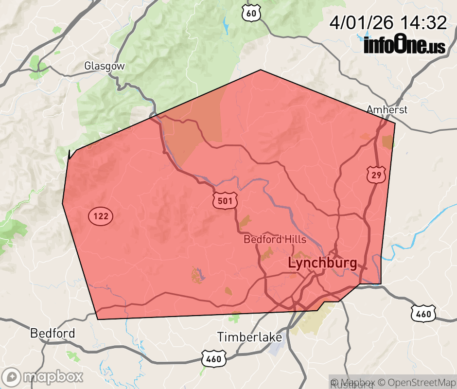 Canceled 4/1/26 2:43 PM Severe Thunderstorm Warning issued April 1 at 2:31PM EDT until April 1 at 3:15PM EDT by NWS Blacksburg VA At 230 PM EDT, a severe thunderstorm was located near Goode, or near Forest, moving east at 25 mph. HAZARD...60 mph wind gusts and quarter size hail. SOURCE...Spotter reported quarter size hail. IMPACT...Hail damage to vehicles is expected. Expect wind damage to roofs, siding, and trees. Locations impacted include... Lynchburg... Amherst... Big Island... Forest... Coleman Falls... Madison Heights... and Boonsboro. ![]() |