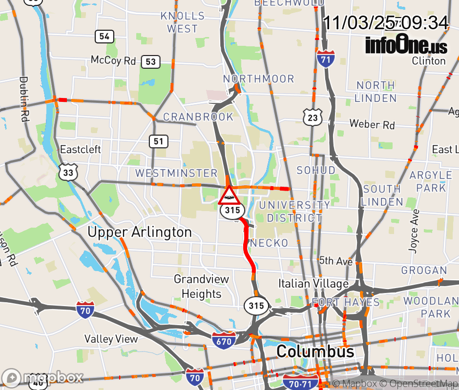 The 2 left lanes are blocked on SR-315 South beyond W Lane Ave, due to a crash. Updated: Mon 11/3/25 9:34 AM EST ![]() Updated: Mon 11/3/25 9:34 AM EST  |