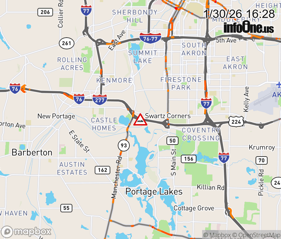 The 2 left lanes are blocked on I-277/US-224 East beyond SR-93/Waterloo Rd/Manchester Rd, due to a disabled vehicle. Updated: Fri 1/30/26 4:28 PM EST ![]() Updated: Fri 1/30/26 4:28 PM EST |