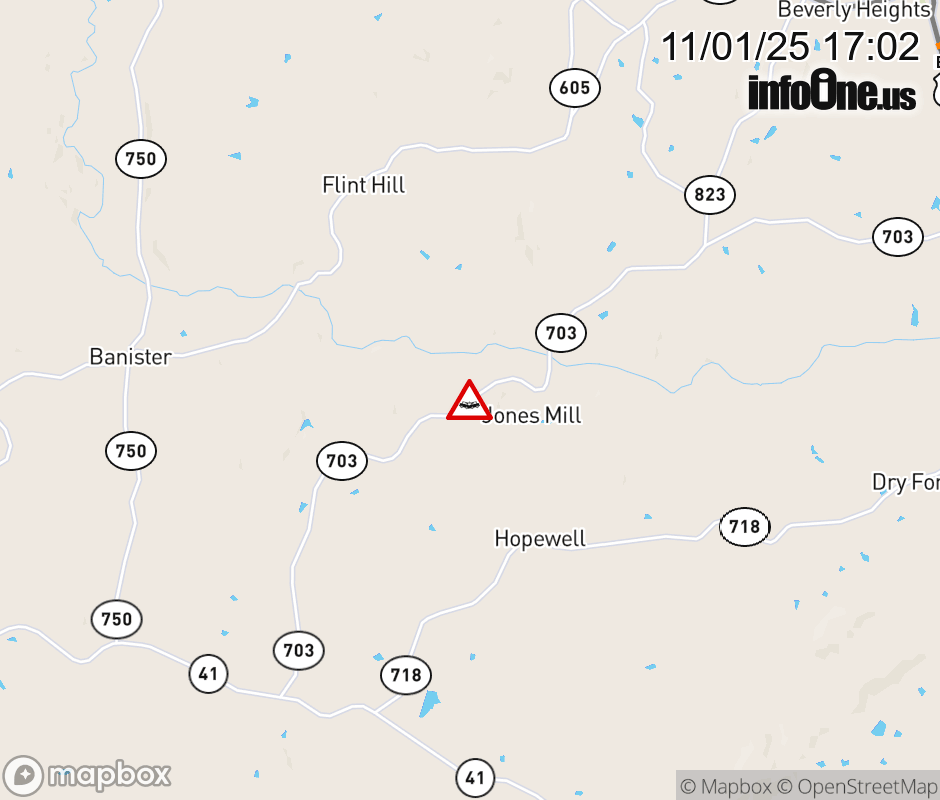 On Rt. 703 North in the County of Pittsylvania, in the vicinity of Jones Mill Rd; Rt. 834N/S (Pittsylvania County), motorists can expect delays due to a vehicle crash. Lane closures exist. ![]() |