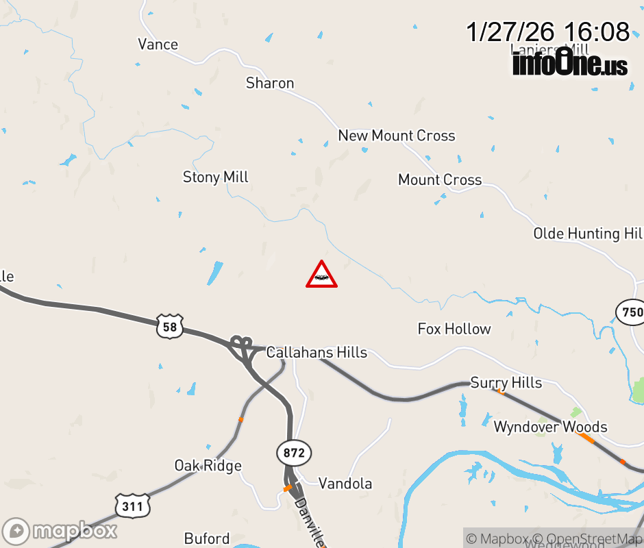 On Rt. 873 in the County of Pittsylvania, in the vicinity of Meadowview Dr; Rt. 872N/S (Pittsylvania County), motorists can expect delays due to a tractor trailer crash. All east lanes are closed. All west lanes are closed. Updated: Tue 1/27/26 4:08 PM EST ![]() Updated: Tue 1/27/26 4:08 PM EST |