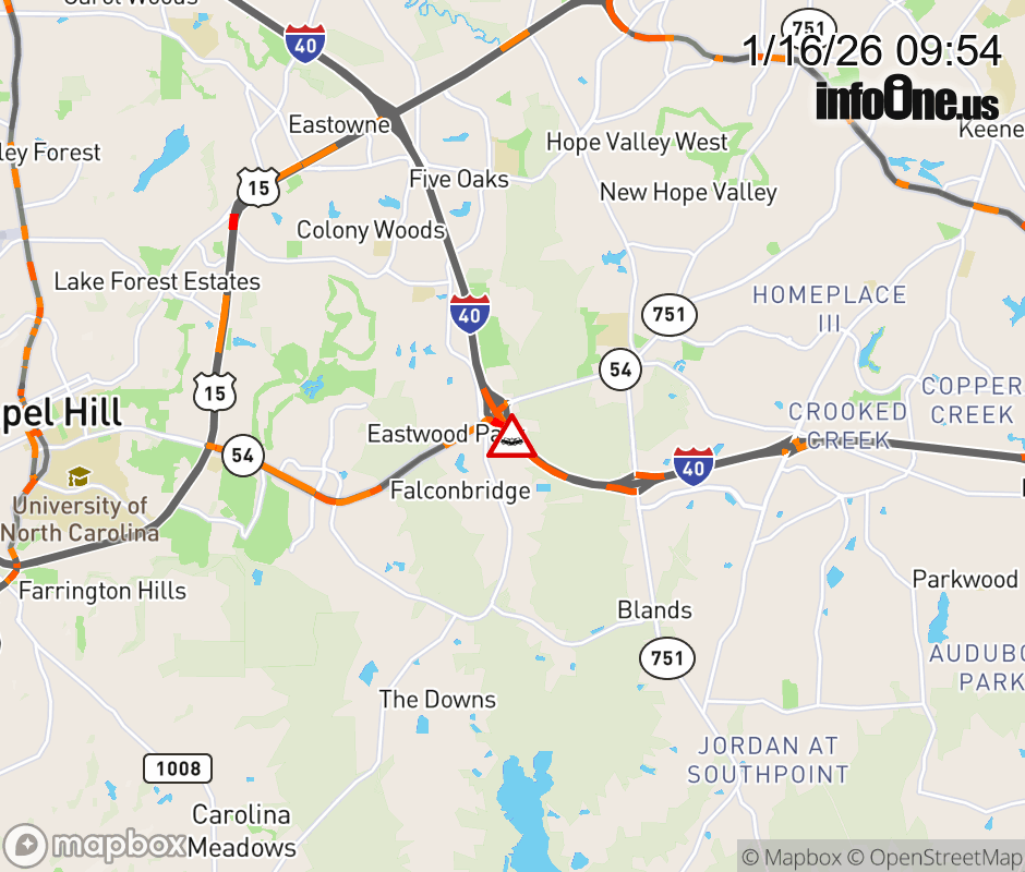 The right shoulder is closed at Exit 273 (NC-54). Updated: Fri 1/16/26 9:54 AM EST ![]() Updated: Fri 1/16/26 9:54 AM EST |