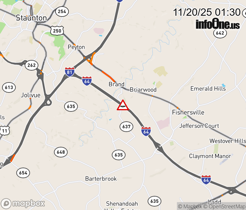 On I-64 West at mile marker 89.6 in the County of Augusta, motorists can expect delays due to a vehicle crash. Updated: Thu 11/20/25 1:30 AM EST ![]() Updated: Thu 11/20/25 1:30 AM EST |