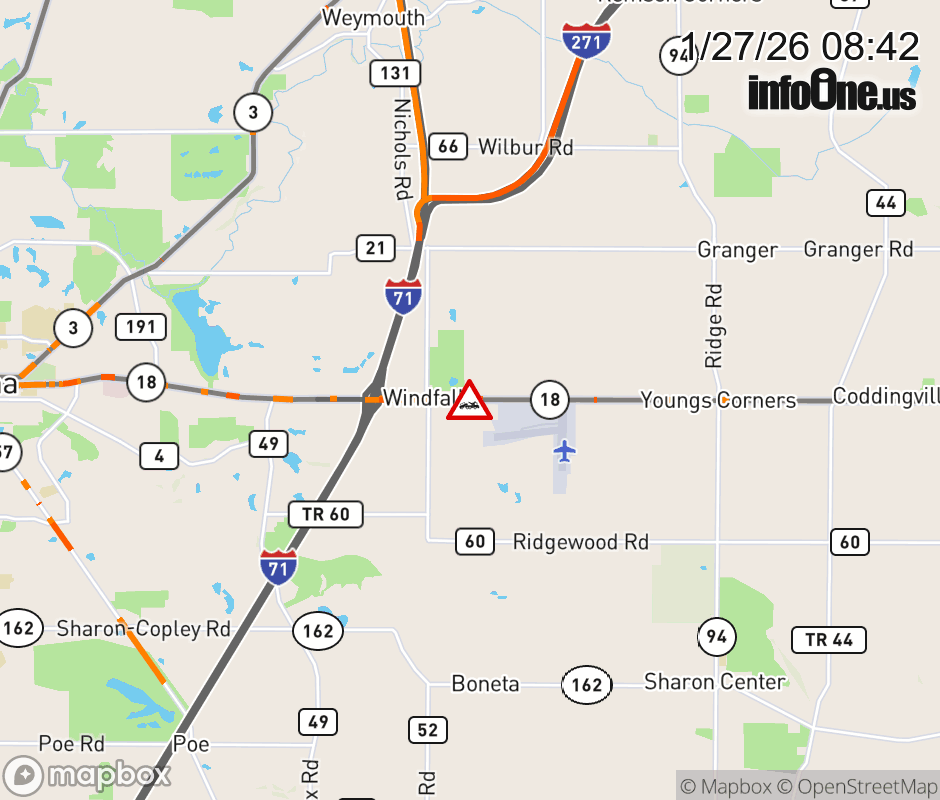 The right lane is blocked on SR-18 East at Boneta Rd, due to a disabled vehicle. Updated: Tue 1/27/26 8:42 AM EST ![]() Updated: Tue 1/27/26 8:42 AM EST |