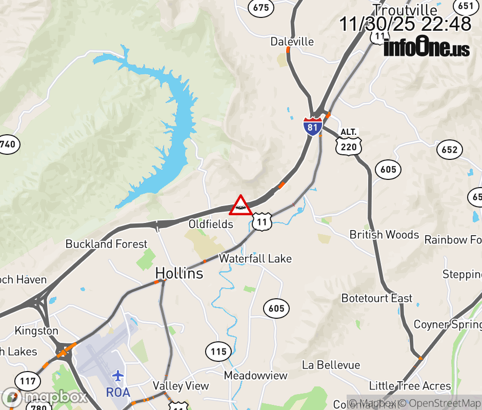 On I-81 at mile marker 148.1 in the County of Botetourt, motorists can expect delays due to a vehicle crash. The south left shoulder and left lane are closed. Traffic backups are approximately 1.0 mile. Updated: Sun 11/30/25 10:48 PM EST ![]() Updated: Sun 11/30/25 10:48 PM EST |