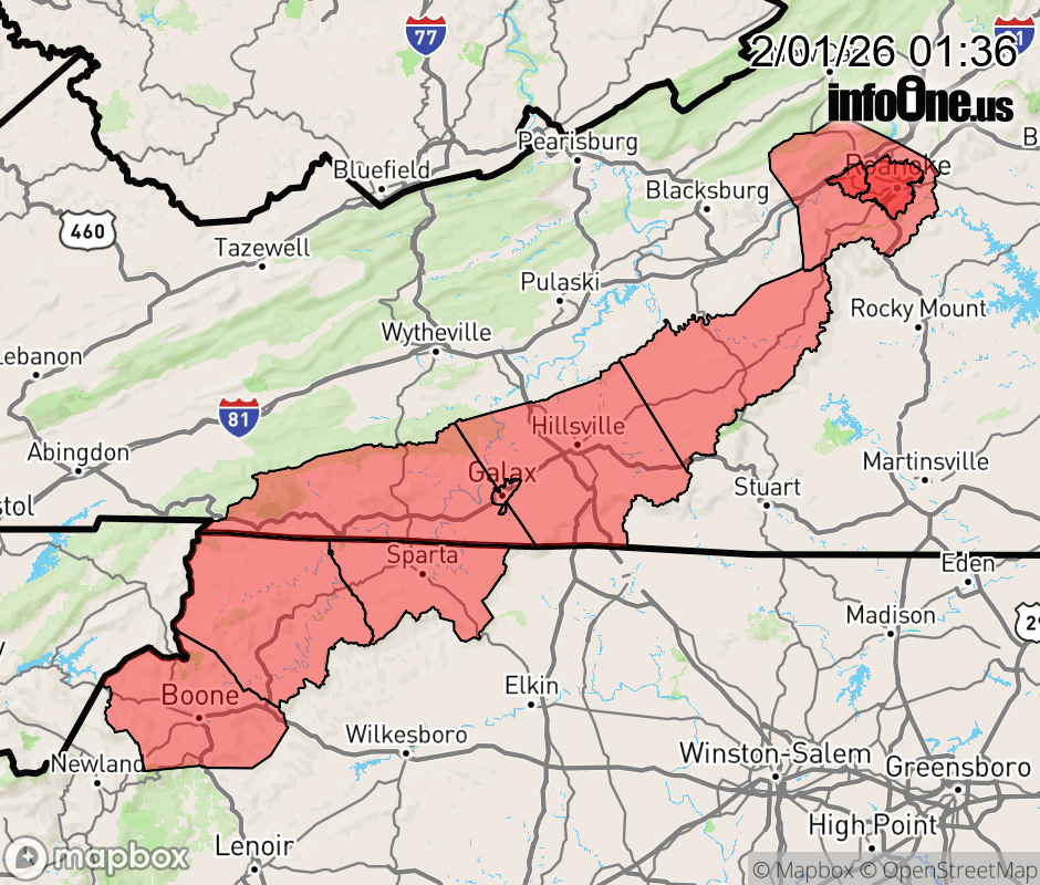 Canceled 2/1/26 9:55 AM Extreme Cold Warning issued February 1 at 1:35AM EST until February 1 at 1:00PM EST by NWS Blacksburg VA * WHAT... For the Extreme Cold Warning, dangerously cold wind chills as low as 20 below expected. For the Wind Advisory, northwest winds 15 to 25 mph with gusts up to 50 mph expected. * WHERE... In North Carolina, Alleghany NC, Ashe, and Watauga Counties. In Virginia, Carroll, Floyd, Grayson, and Roanoke Counties. * WHEN... For the Extreme Cold Warning, until 1 PM EST this afternoon. For the Wind Advisory, until 4 PM EST this afternoon. * IMPACTS... Gusty winds will blow around unsecured objects. Tree limbs could be blown down and a few power outages may result. The dangerously cold wind chills as low as 20 below zero could cause frostbite on exposed skin in as little as 30 minutes. Frostbite and hypothermia will occur if unprotected skin is exposed to these temperatures. ![]() |