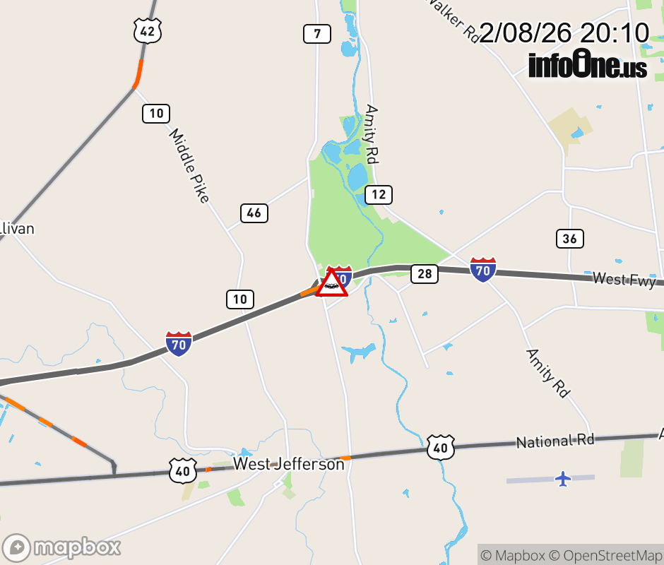 The 2 left lanes are blocked on I-70 West at SR-142/West Jefferson/Plain City, due to a crash. ![]() |