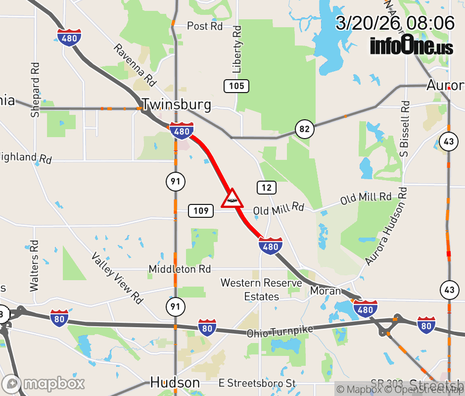 Expect lane closures on I-480/SR-14 West beyond Aurora Hudson Rd/Frost Rd, due to a crash. ![]() |