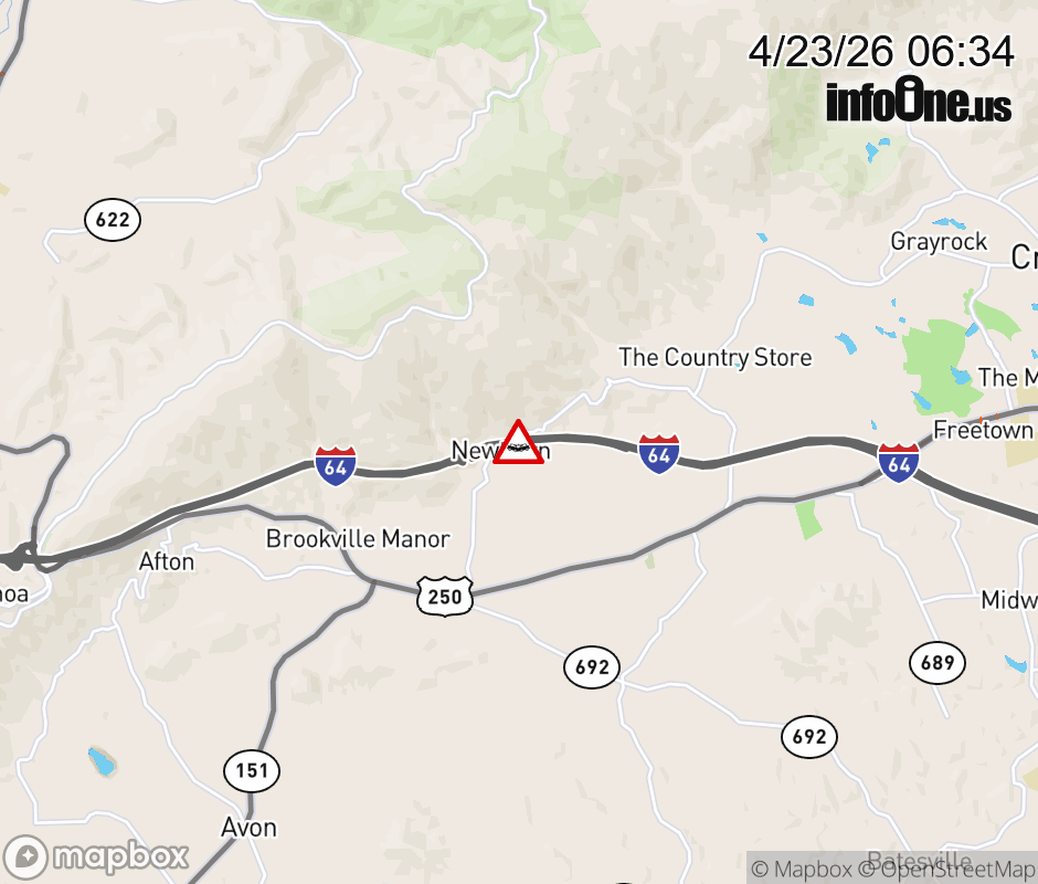 On I-64 at mile marker 104.2 in the County of Albemarle, motorists can expect delays due to a vehicle crash. The east right shoulder is closed. ![]() |