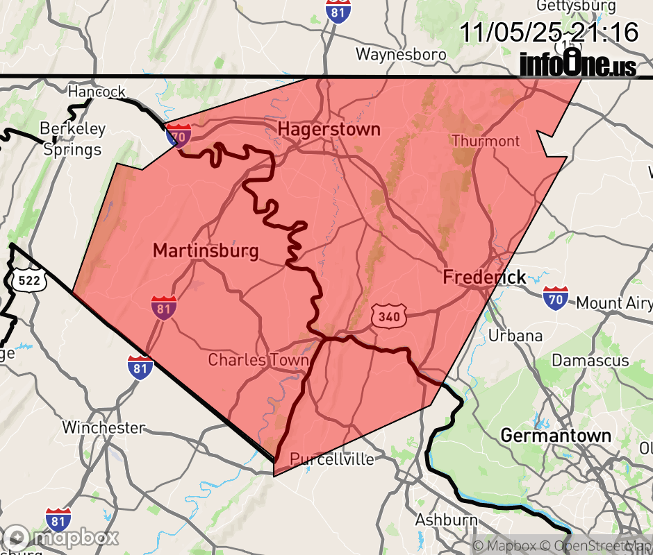 Canceled 11/5/25 9:43 PM Severe Thunderstorm Warning issued November 5 at 9:15PM EST until November 5 at 9:45PM EST by NWS Baltimore MD/Washington DC At 915 PM EST, severe thunderstorms were located along a line extending from near Thurmont to near Wolfsville to Boonsboro to Inwood, moving east at 45 mph. HAZARD...60 mph wind gusts. SOURCE...Radar indicated and observed wind at Hagerstown Regional Airport and near Thurmont. IMPACT...Damaging winds will cause some trees and large branches to fall. This could injure those outdoors, as well as damage homes and vehicles. Roadways may become blocked by downed trees. Localized power outages are possible. Unsecured light objects may become projectiles. Locations impacted include... Frederick, Hagerstown, Martinsburg, Thurmont, Charles Town, Emmitsburg, Shepherdstown, Municipal Stadium, Harry Grove Stadium, Ballenger Creek, Purcellville, Robinwood, Brunswick, Walkersville, Fountainhead-Orchard Hills, Ranson, Boonsboro, Smithsburg, Inwood, and Braddock Heights. ![]() |
