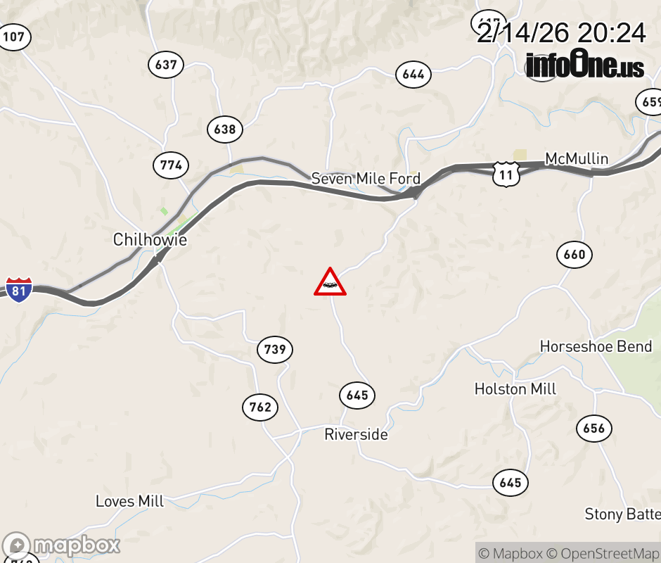 On Rt. 645 North in the County of Smyth, in the vicinity of Dillard Rd; Rt. 646E/W (Smyth County), motorists can expect delays due to a vehicle crash. Lane closures exist. Updated: Sat 2/14/26 8:24 PM EST ![]() Updated: Sat 2/14/26 8:24 PM EST |