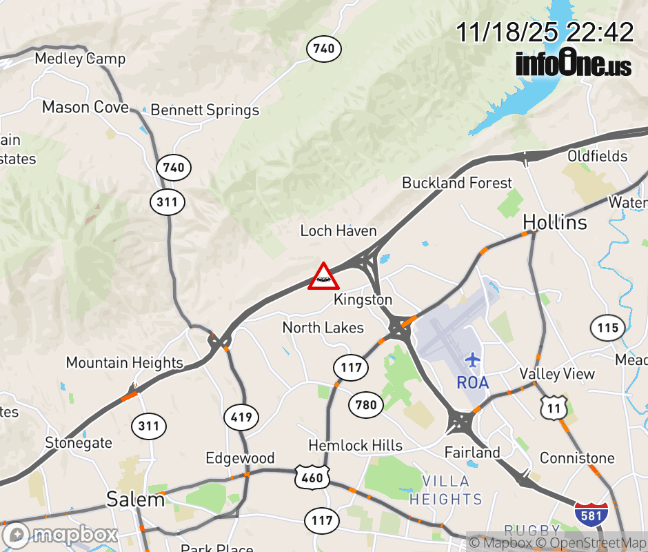 On I-81 at mile marker 143.2 in the County of Roanoke, motorists can expect delays due to a tractor trailer crash. The north right lane and right shoulder are closed. Updated: Tue 11/18/25 10:42 PM EST ![]() |