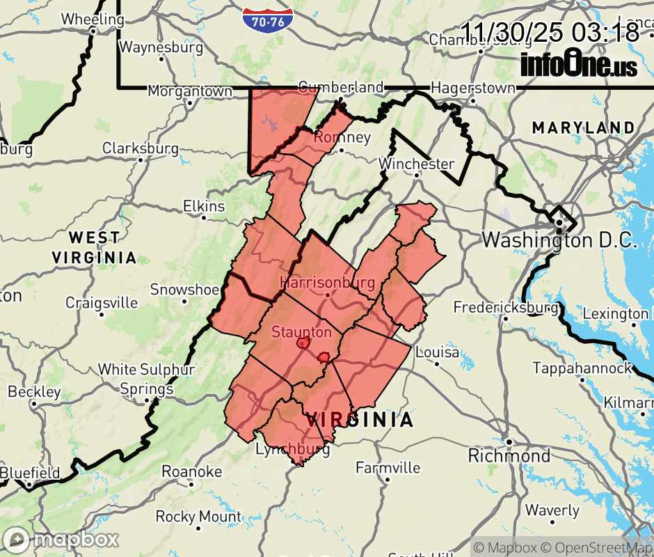 Canceled 11/30/25 10:56 AM Winter Weather Advisory issued November 30 at 3:17AM EST until November 30 at 12:00PM EST by NWS Baltimore MD/Washington DC * WHAT... Mixed precipitation expected. Total snow and sleet accumulations up to one inch and ice accumulations around a light glaze. Winds gusting as high as 35 mph. * WHERE... Portions of western Maryland, central, northwest, and western Virginia, and eastern West Virginia. * WHEN... Until noon EST today. * IMPACTS... Plan on slippery road conditions. ![]() |