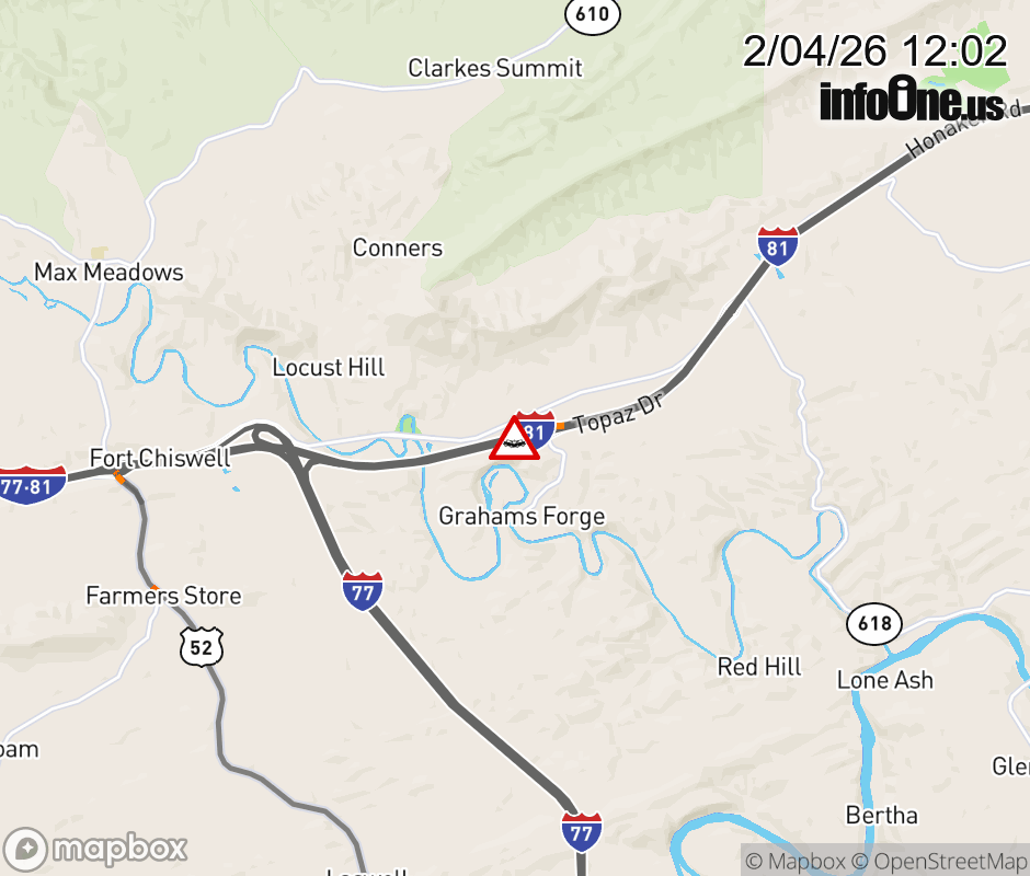 On I-81 at mile marker 83.8 in the County of Wythe, motorists can expect delays due to a tractor trailer crash. The south right shoulder is closed. ![]() |
