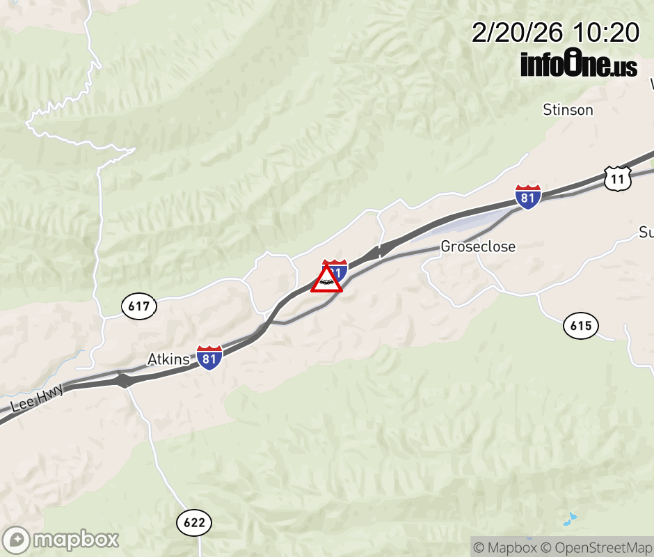 On I-81 at mile marker 54 in the County of Smyth, motorists can expect delays due to a vehicle crash. The north right lane and right shoulder are closed. ![]() |