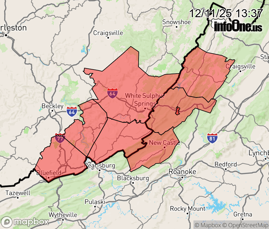 Canceled 12/11/25 9:21 PM Winter Weather Advisory issued December 11 at 1:33PM EST until December 12 at 7:00PM EST by NWS Blacksburg VA An area of low pressure over the central U.S. will move east into the lower Ohio Valley tonight, then across the central Mid-Atlantic Friday. This system will bring a period of snow, with the heaviest accumulations west of I-81. * WHAT... Snow expected. Total snow accumulations between 2 and 5 inches. * WHERE... Portions of southwest and west central Virginia and southeast West Virginia... includes the Greenbrier Valley of West Virginia and Highlands of Virginia. * WHEN... From midnight tonight to 7 PM EST Friday. * IMPACTS... Plan on slippery road conditions. The hazardous conditions could impact the Friday morning and evening commutes. ![]() |