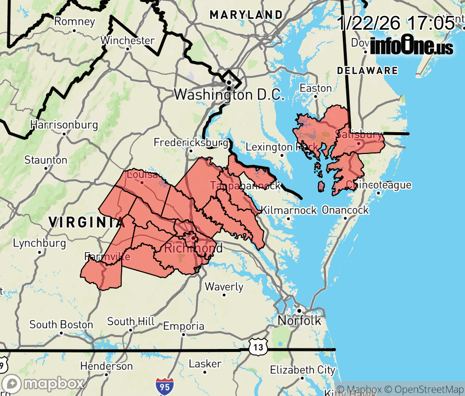 Canceled 1/23/26 12:37 AM Winter Storm Watch issued January 22 at 5:03PM EST until January 26 at 1:00PM EST by NWS Wakefield VA * WHAT... Heavy mixed precipitation possible. Confidence is increasing in widespread snow, sleet, and freezing rain. This may result in major impacts in infrastructure and transportation. * WHERE... Portions of southeast Maryland and central, east central, and north central Virginia. * WHEN... From Saturday afternoon through Monday afternoon. * IMPACTS... Roads, and especially bridges and overpasses, will likely become slick and hazardous. The combination of significant snow and ice accumulation on power lines and tree limbs may cause widespread and long-lasting power outages. ![]() |