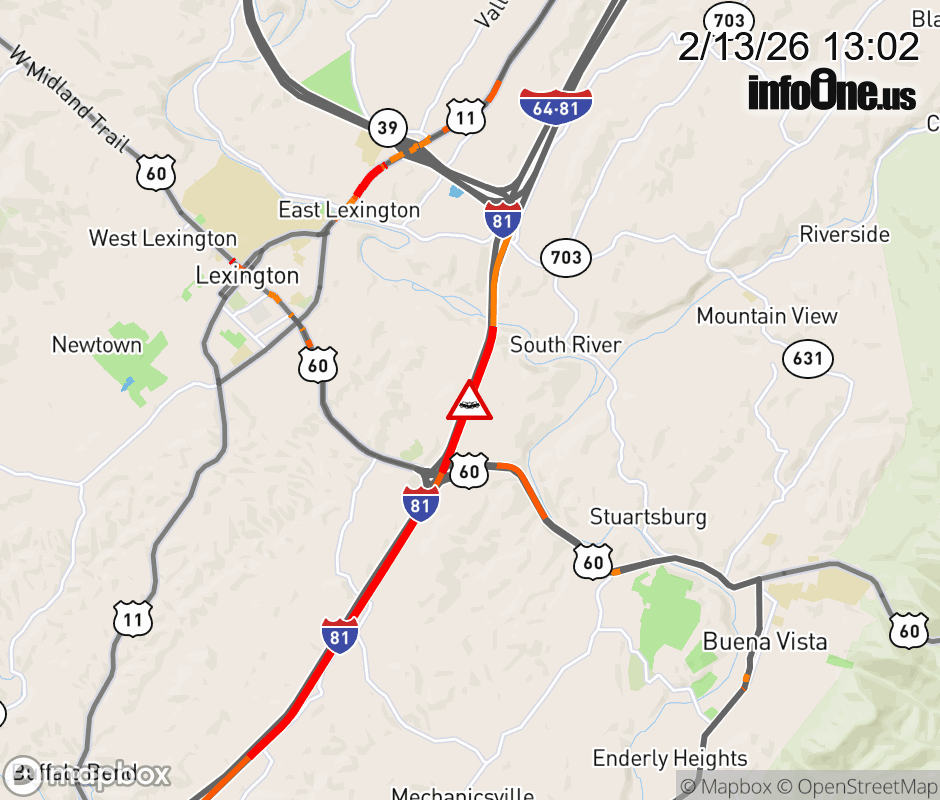 On I-81 North at mile marker 189.5 in the County of Rockbridge, motorists can expect delays due to a tractor trailer crash. Traffic backups are approximately 2.0 miles. Updated: Fri 2/13/26 1:02 PM EST ![]() Updated: Fri 2/13/26 1:02 PM EST |