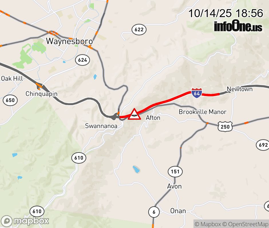 On I-64 West at mile marker 100.3 in the County of Albemarle, motorists can expect delays due to a vehicle crash. Traffic backups are approximately 2.0 miles. Updated: Tue 10/14/25 6:56 PM EDT ![]() Updated: Tue 10/14/25 6:56 PM EDT |