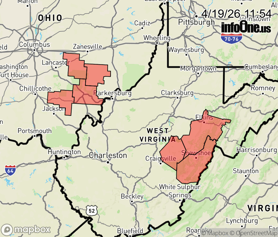 Canceled 4/19/26 6:47 PM Freeze Warning issued April 19 at 11:53AM EDT until April 20 at 10:00AM EDT by NWS Charleston WV * WHAT... For the Freeze Warning, sub-freezing temperatures as low as 29 expected. For the Freeze Watch, sub-freezing temperatures as low as 25 possible. * WHERE... In Ohio, Athens, Morgan, Perry, and Vinton Counties. In West Virginia, Northwest Pocahontas, Northwest Randolph, Southeast Randolph, and Southeast Webster Counties. * WHEN... For the Freeze Warning, from 2 AM to 10 AM EDT Monday. For the Freeze Watch, from Monday evening through Tuesday morning. * IMPACTS... Frost and freeze conditions could kill crops, other sensitive vegetation and possibly damage unprotected outdoor plumbing. ![]() |