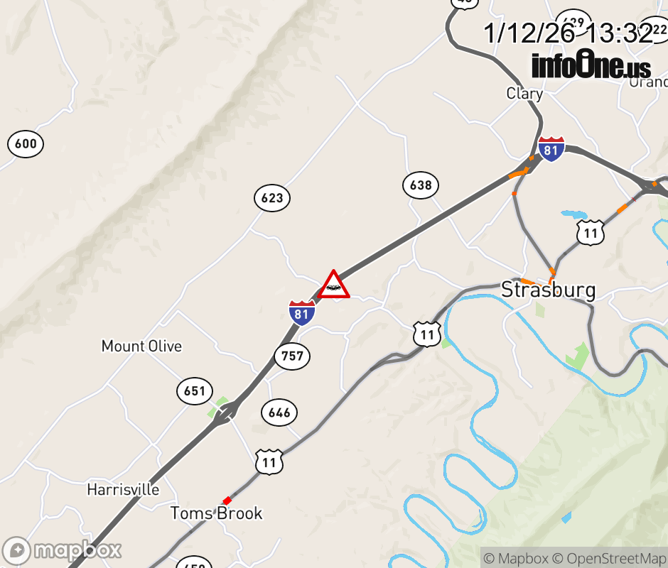 On I-81 at mile marker 293.5 in the County of Shenandoah, motorists can expect delays due to a tractor trailer crash. The north right shoulder is closed. Updated: Mon 1/12/26 1:32 PM EST ![]() Updated: Mon 1/12/26 1:32 PM EST |