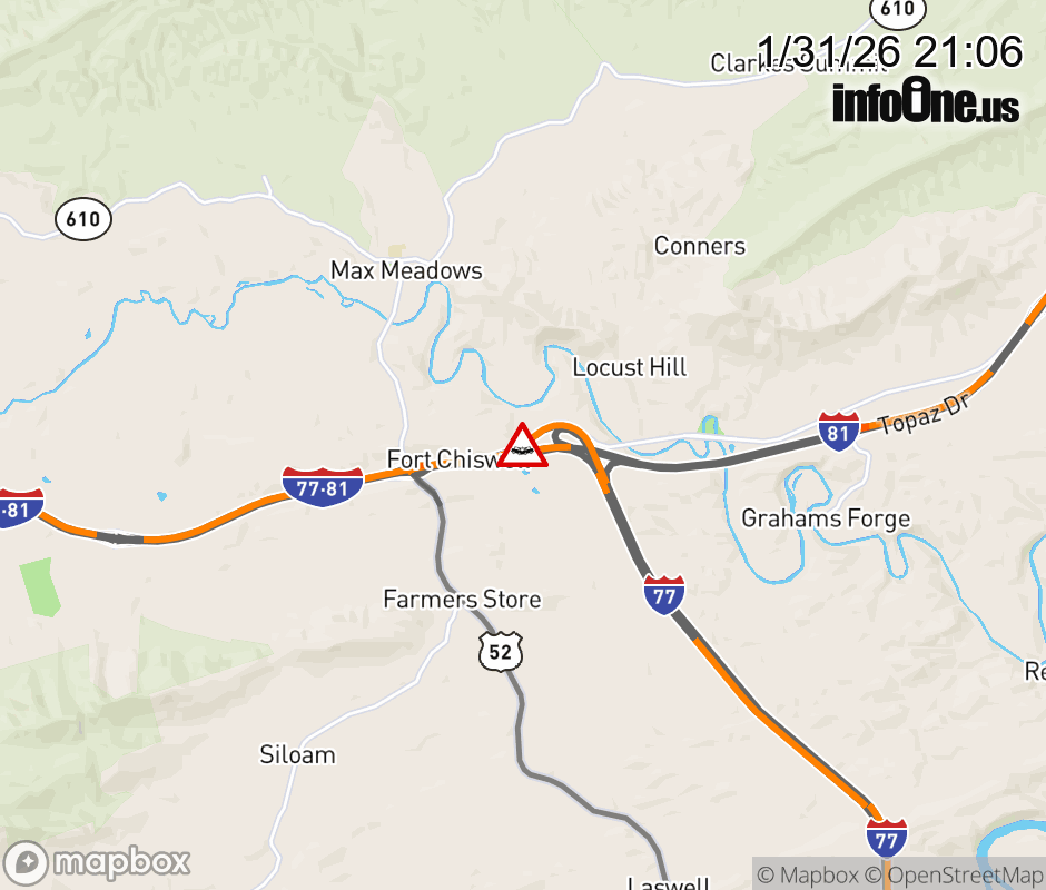 On I-77 at mile marker 33 in the County of Wythe, motorists can expect delays due to a vehicle crash. The north left shoulder and left lane are closed. Updated: Sat 1/31/26 9:06 PM EST ![]() Updated: Sat 1/31/26 9:06 PM EST |