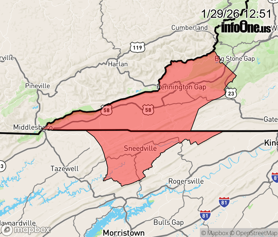 Canceled 1/29/26 10:37 PM Winter Storm Warning issued January 29 at 12:50PM EST until February 1 at 1:00AM EST by NWS Morristown TN * WHAT... Heavy snow expected. Total snow accumulations between 2 and 5 inches possible. * WHERE... In Tennessee, Hancock County. In Virginia, Lee County. * WHEN... From 1 PM Friday to 1 AM EST Sunday. * IMPACTS... Plan on slippery road conditions. The hazardous conditions could impact the Friday evening commute. ![]() |