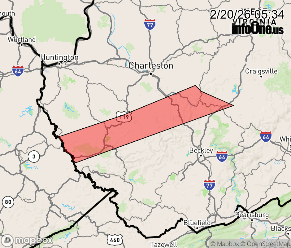 Flash Flood Warning issued February 20 at 5:32AM EST until February 20 at 8:30AM EST by NWS Charleston WV FFWRLX The National Weather Service in Charleston has issued a * Flash Flood Warning for... Central Boone County in central West Virginia... Southeastern Kanawha County in central West Virginia... Southwestern Lincoln County in central West Virginia... Northwestern Fayette County in southeastern West Virginia... Northwestern Raleigh County in southeastern West Virginia... Northwestern Logan County in southern West Virginia... Northwestern Mingo County in southern West Virginia... South Central Wayne County in western West Virginia... * Until 830 AM EST. * At 532 AM EST, Doppler radar indicated thunderstorms producing heavy rain across the warned area. Between 1.5 and 2 inches of rain have fallen. Flash flooding is ongoing or expected to begin shortly. HAZARD...Flash flooding caused by thunderstorms. SOURCE...Radar. IMPACT...Flash flooding of small creeks and streams, urban areas, highways, streets and underpasses as well as other poor drainage and low-lying areas. * Some locations that will experience flash flooding include... Madison, Logan, Montgomery, Ansted, Chapmanville, Glasgow, Smithers, Gauley Bridge, Pratt, Van, Chief Logan State Park, Burnwell, Mount Gay-Shamrock, Holden, Powellton, Harts, Hawks Nest State Park, Danville, Whitesville and West Logan. ![]() |