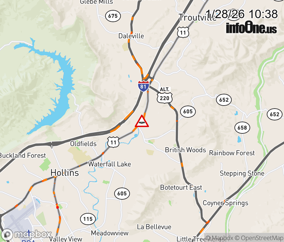 On US-11 in the County of Botetourt, in the vicinity of Updike Ln; Rt. 1001N/S (Botetourt County), motorists can expect delays due to a tractor trailer crash. All south lanes are closed. ![]() |
