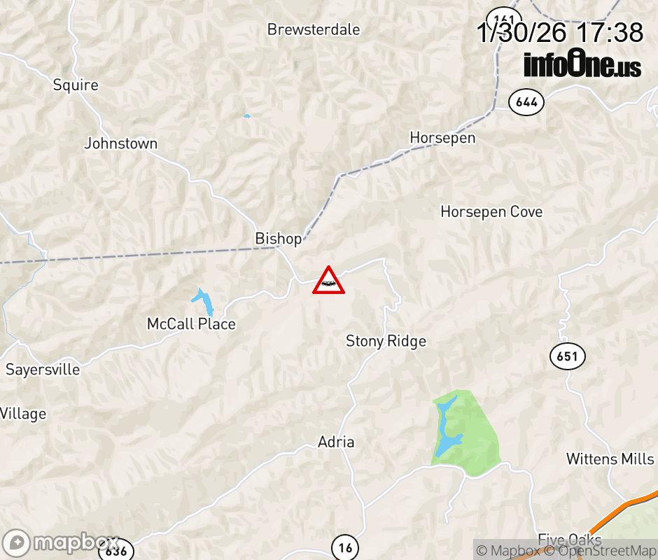 On VA-16 in the County of Tazewell, in the vicinity of Crocketts Cove Rd; Rt. 642E/W (Tazewell County), motorists can expect delays due to a tractor trailer crash. All north lanes are closed. All south lanes are closed. Updated: Fri 1/30/26 5:38 PM EST ![]() Updated: Fri 1/30/26 5:38 PM EST |