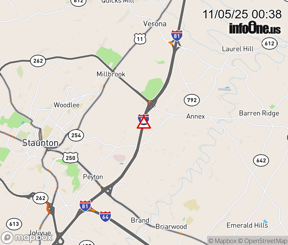On I-81 at mile marker 225 in the County of Augusta, motorists can expect delays due to a vehicle crash. The north right lane and right shoulder are closed. Updated: Wed 11/5/25 12:38 AM EST ![]() |