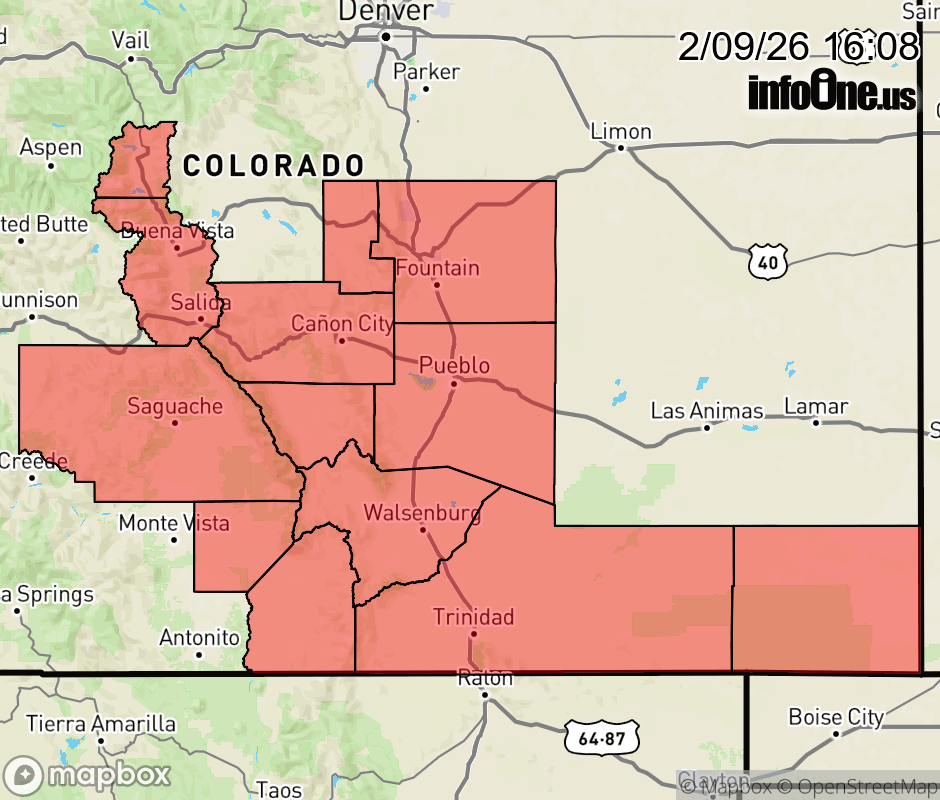 Canceled 2/9/26 6:00 PM Red Flag Warning issued February 9 at 2:06PM MST until February 9 at 6:00PM MST by NWS Pueblo CO * AFFECTED AREA... Fire Weather Zones 220, 221, 222, 225, 228, 229, 230, 233 and 237. * WINDS... West 10 to 20 mph with gusts up to 35 mph. * RELATIVE HUMIDITY... As low as 7 percent. * IMPACTS... Fires will catch and spread quickly. Exercise extreme caution with any outdoor burning. ![]() |