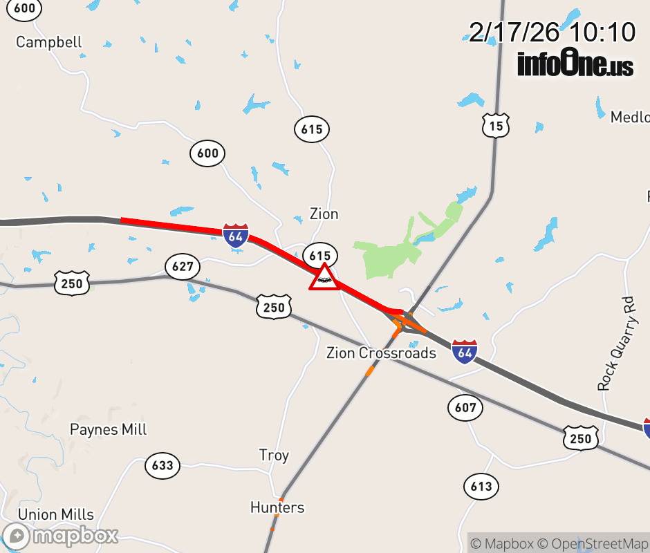 On I-64 West at mile marker 135.7 in the County of Louisa, motorists can expect delays due to a multi-vehicle crash. Traffic backups are approximately 2.0 miles. Updated: Tue 2/17/26 10:10 AM EST ![]() Updated: Tue 2/17/26 10:10 AM EST |