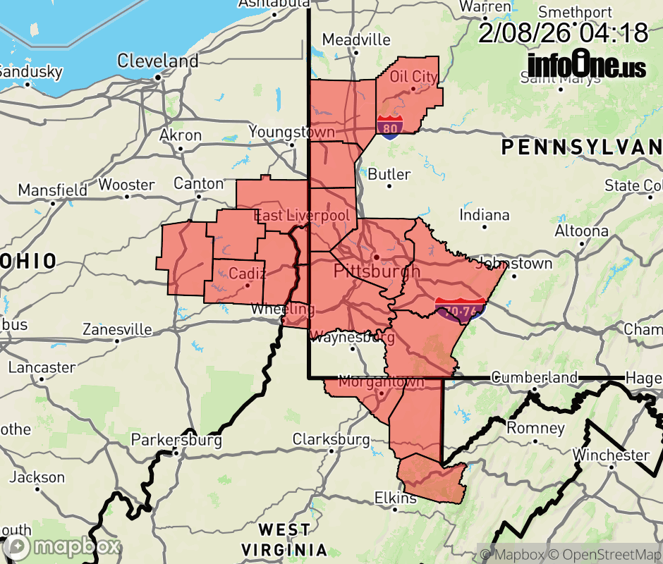 Canceled 2/8/26 9:59 AM Cold Weather Advisory issued February 8 at 4:17AM EST until February 8 at 10:00AM EST by NWS Pittsburgh PA * WHAT... Very cold wind chills as low as 15 below zero. * WHERE... Portions of east central Ohio, western Pennsylvania, and northern West Virginia. * WHEN... Until 10 AM EST this morning. * IMPACTS... The cold wind chills as low as 15 below zero could result in hypothermia or frostbite if precautions are not taken. ![]() |