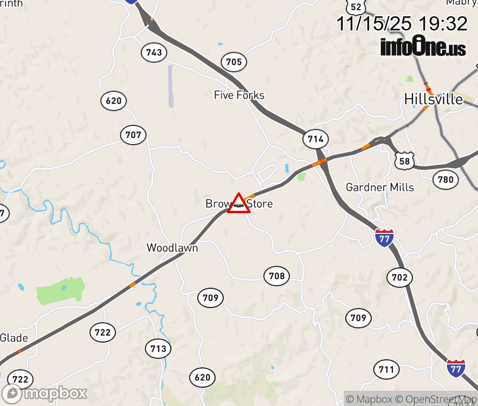 On US-58 West in the County of Carroll, in the vicinity of Looking Glass Dr; Rt. 1075N/S (Carroll County), motorists can expect delays due to a vehicle crash. Lane closures exist. ![]() |