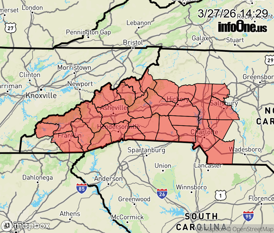 Canceled 3/27/26 5:41 PM Red Flag Warning issued March 27 at 2:27PM EDT until March 28 at 11:00PM EDT by NWS Greenville-Spartanburg SC ...FIRE WEATHER WATCH FOR GUSTY WINDS, DRY FUELS, AND LOW HUMIDITY ON SATURDAY... The National Weather Service in Greenville-Spartanburg has issued a Red Flag Warning for wind and low relative humidity, which is in effect from 8 AM to 11 PM EDT Saturday. * AFFECTED AREA... Avery, Alexander, Iredell, Davie, Madison, Yancey, Mitchell, Swain, Haywood, Buncombe, Catawba, Rowan, Graham, Northern Jackson, Macon, Southern Jackson, Transylvania, Henderson, Cleveland, Lincoln, Gaston, Mecklenburg, Cabarrus, Union, North Carolina Portion of the Great Smoky Mountains National Park, Caldwell Mountains, Greater Caldwell, Burke Mountains, Greater Burke, McDowell Mountains, Eastern McDowell, Rutherford Mountains, Greater Rutherford, Polk Mountains and Eastern Polk. * TIMING... From 8 AM to 11 PM EDT Saturday. * WINDS... Northeast 10 to 25 mph with gusts up to 40 mph. * RELATIVE HUMIDITY... As low as 13 percent. * IMPACTS... Any fire that develops will catch and spread quickly. Outdoor burning is not recommended. ![]() |