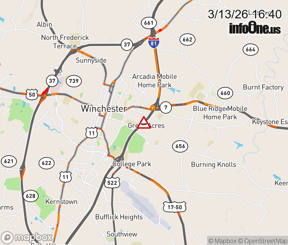 On I-81 at mile marker 315 in the County of Frederick, motorists can expect delays due to a vehicle crash. The north left shoulder is closed. ![]() |
