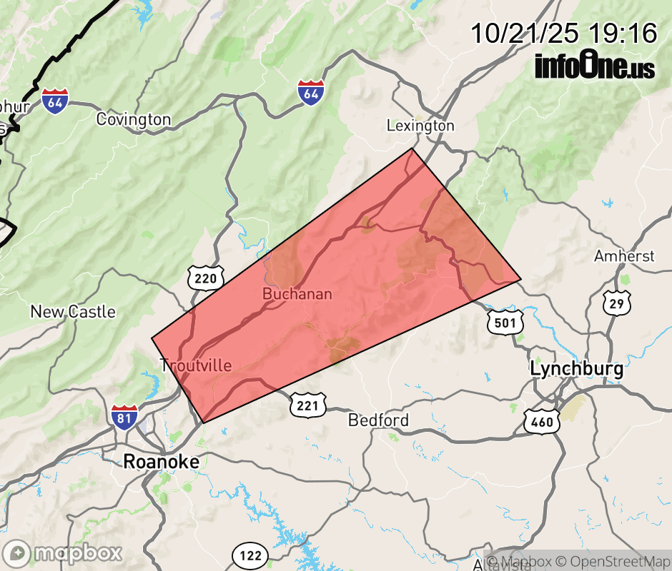 Canceled 10/21/25 7:45 PM Special Weather Statement issued October 21 at 7:14PM EDT by NWS Blacksburg VA At 714 PM EDT, Doppler radar was tracking a strong thunderstorm over Lithia, or near Montvale, moving northeast at 60 mph. HAZARD...Wind gusts up to 40 mph. SOURCE...Radar indicated. IMPACT...Gusty winds could knock down tree limbs and blow around unsecured objects. Locations impacted include... Buchanan... Glasgow... Troutville... Big Island... Montvale... Fincastle... and Snowden. ![]() |