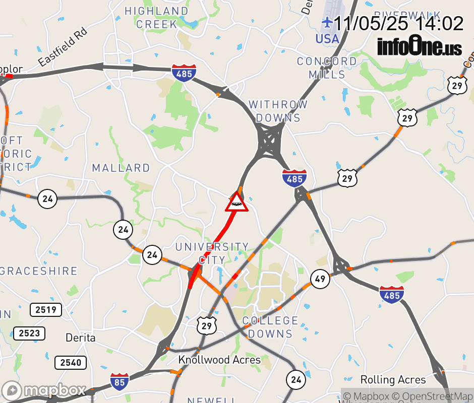 The right shoulder is closed at Exit 46 B (Mallard Creek Church Road). Updated: Wed 11/5/25 2:02 PM EST ![]() Updated: Wed 11/5/25 2:02 PM EST |