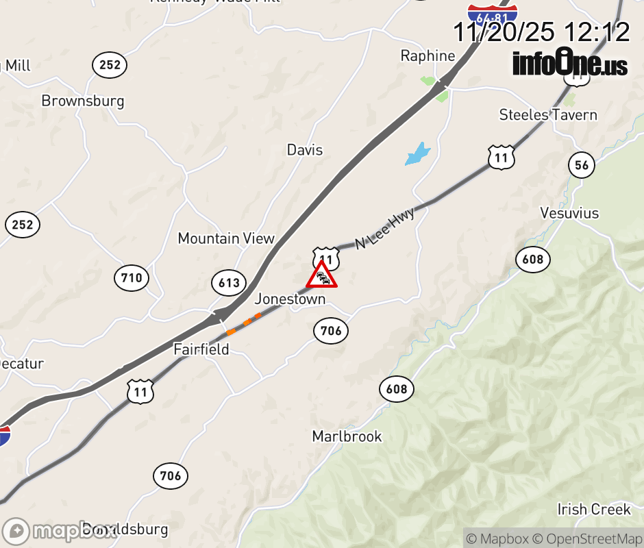 On US-11 in the County of Rockbridge, in the vicinity of Beulah Dr; Calluna Ln; Fairfield Estates Dr; Fairfield Meadow Ln; Rt. 1306N (Rockbridge County); Rt. 797N/S (Rockbridge County), motorists can expect delays due to an incident. The north right lane and right shoulder are closed. Updated: Thu 11/20/25 12:12 PM EST ![]() Updated: Thu 11/20/25 12:12 PM EST |