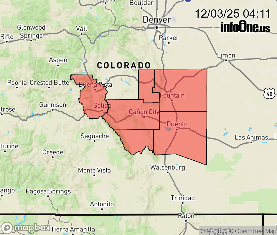 Canceled 12/3/25 10:18 AM Winter Weather Advisory issued December 3 at 2:10AM MST until December 3 at 8:00PM MST by NWS Pueblo CO * WHAT... Snow expected. Total snow accumulations between 2 and 8 inches. The heaviest snow will fall this morning into the afternoon time period. * WHERE... Southern El Paso, Pueblo, Central Chaffee County Below 9000 Feet, Western/Central Fremont County Below 8500 Feet, and Canon City Vicinity/Eastern Fremont County. * WHEN... From 8 AM this morning to 8 PM MST this evening. * IMPACTS... Roads, and especially bridges and overpasses, will likely become slick and hazardous. Travel could be very difficult. The hazardous conditions could impact the Wednesday evening commute. ![]() |