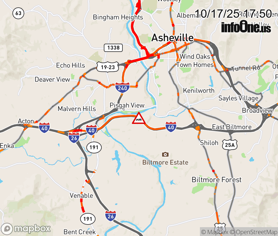 The right lane is closed 1.5 miles west of Exit 50A, US 25 (Hendersonville Road). Updated: Fri 10/17/25 5:50 PM EDT ![]() Updated: Fri 10/17/25 5:50 PM EDT |
