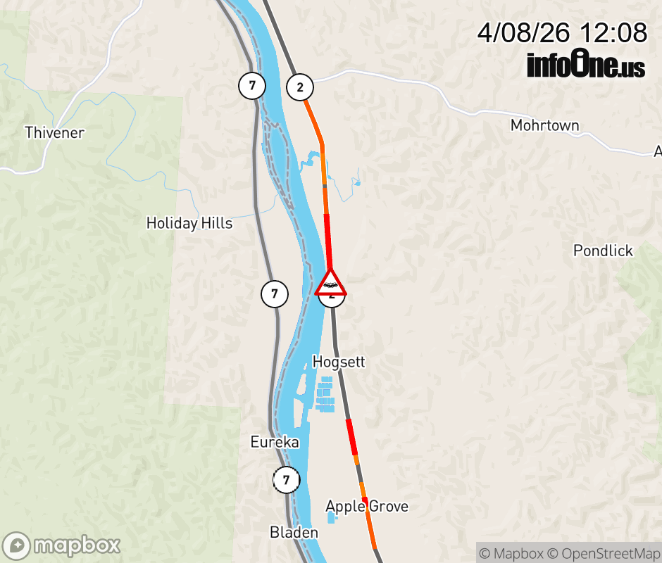 Vehicle Crash on WV-2 (Huntington Rd) & CR-56 (Mud Run Rd) in Gallipolis Ferry/Apple Grove. The southbound road is closed. The northbound road is closed. Updated: Wed 4/8/26 12:08 PM EDT ![]() Updated: Wed 4/8/26 12:08 PM EDT |