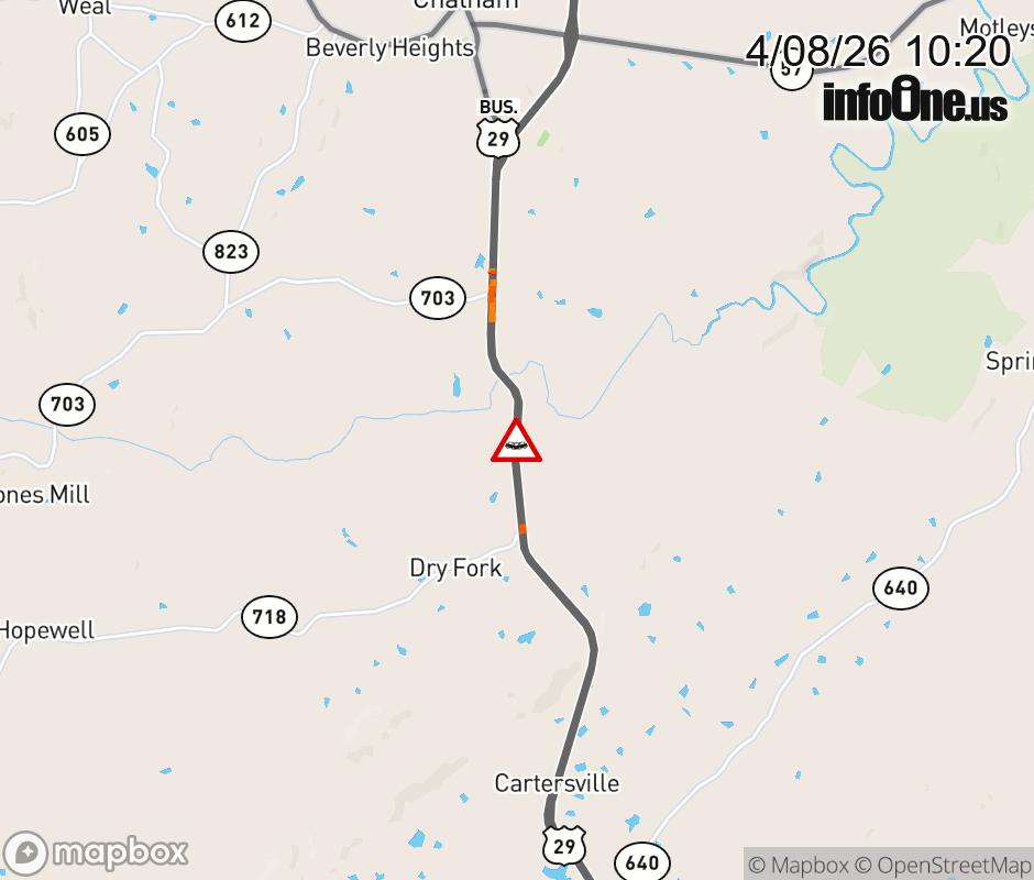On US-29 in the County of Pittsylvania, in the vicinity of Rt. 9313E/W (Pittsylvania County), motorists can expect delays due to a vehicle crash. The north left shoulder and left lane are closed. ![]() |