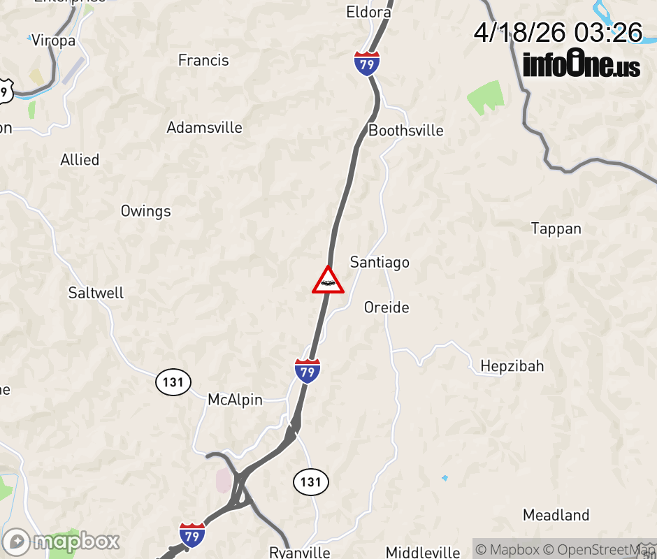 Vehicle Crash on I-79S at Mile Marker 127.0. Updated: Sat 4/18/26 3:26 AM EDT ![]() Updated: Sat 4/18/26 3:26 AM EDT |