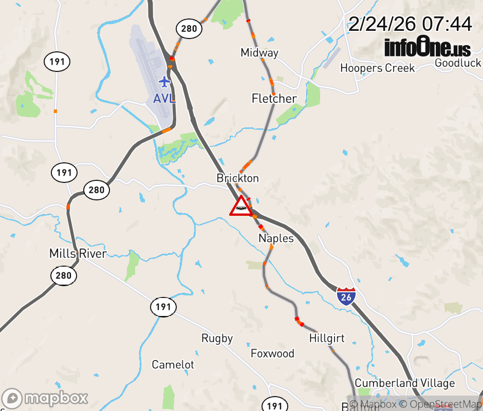 The right shoulder is closed at Exit 44, US 25-Bus (Asheville Highway). Updated: Tue 2/24/26 7:44 AM EST ![]() Updated: Tue 2/24/26 7:44 AM EST |
