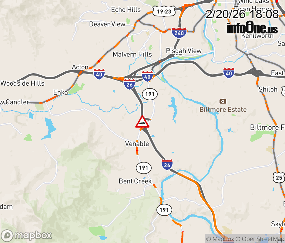 The right shoulder is closed at Exit 33, NC 191 (Brevard Road). Updated: Fri 2/20/26 6:08 PM EST ![]() Updated: Fri 2/20/26 6:08 PM EST |