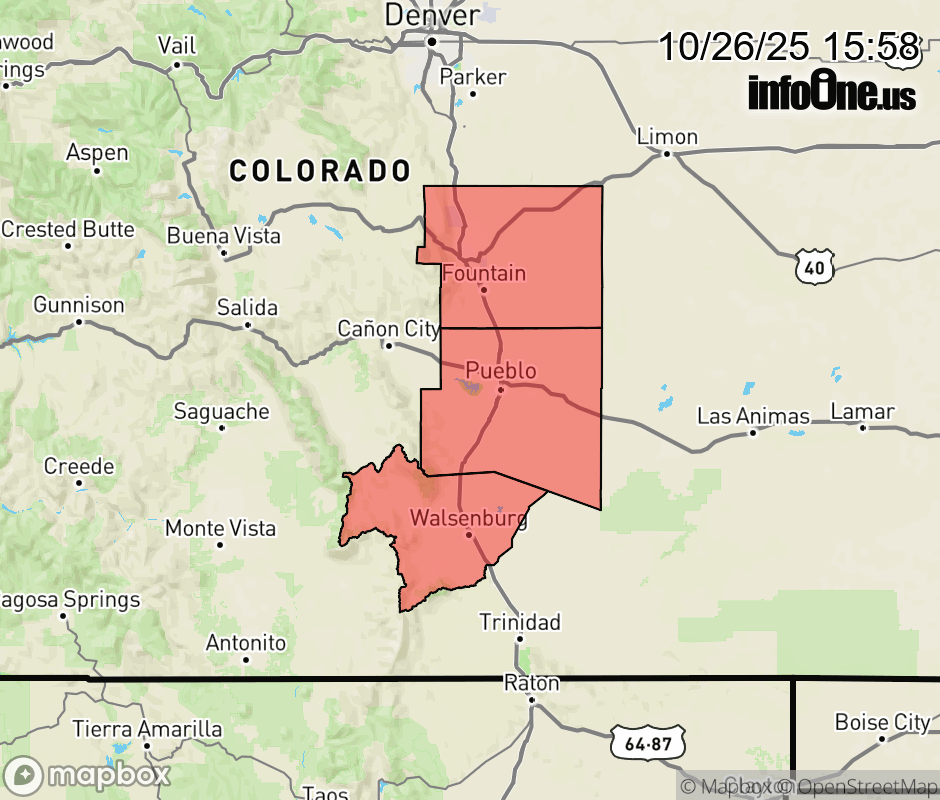 Canceled 10/27/25 5:07 AM Red Flag Warning issued October 26 at 1:56PM MDT until October 27 at 6:00PM MDT by NWS Pueblo CO The National Weather Service in Pueblo has issued a Red Flag Warning for gusty winds and low relative humidity, which is in effect from noon to 6 PM MDT Monday. The Fire Weather Watch is no longer in effect. * AFFECTED AREA... Fire Weather Zones 227, 228 and 229. * WINDS... West 10 to 20 mph with gusts up to 35 mph. * RELATIVE HUMIDITY... 10 to 15 percent. * IMPACTS... Fires will catch and spread quickly. Exercise extreme caution with any outdoor burning. ![]() |