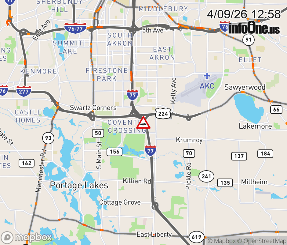 The right lane is blocked on I-77 South beyond US-224 East, due to a disabled vehicle. Updated: Thu 4/9/26 12:58 PM EDT ![]() Updated: Thu 4/9/26 12:58 PM EDT |